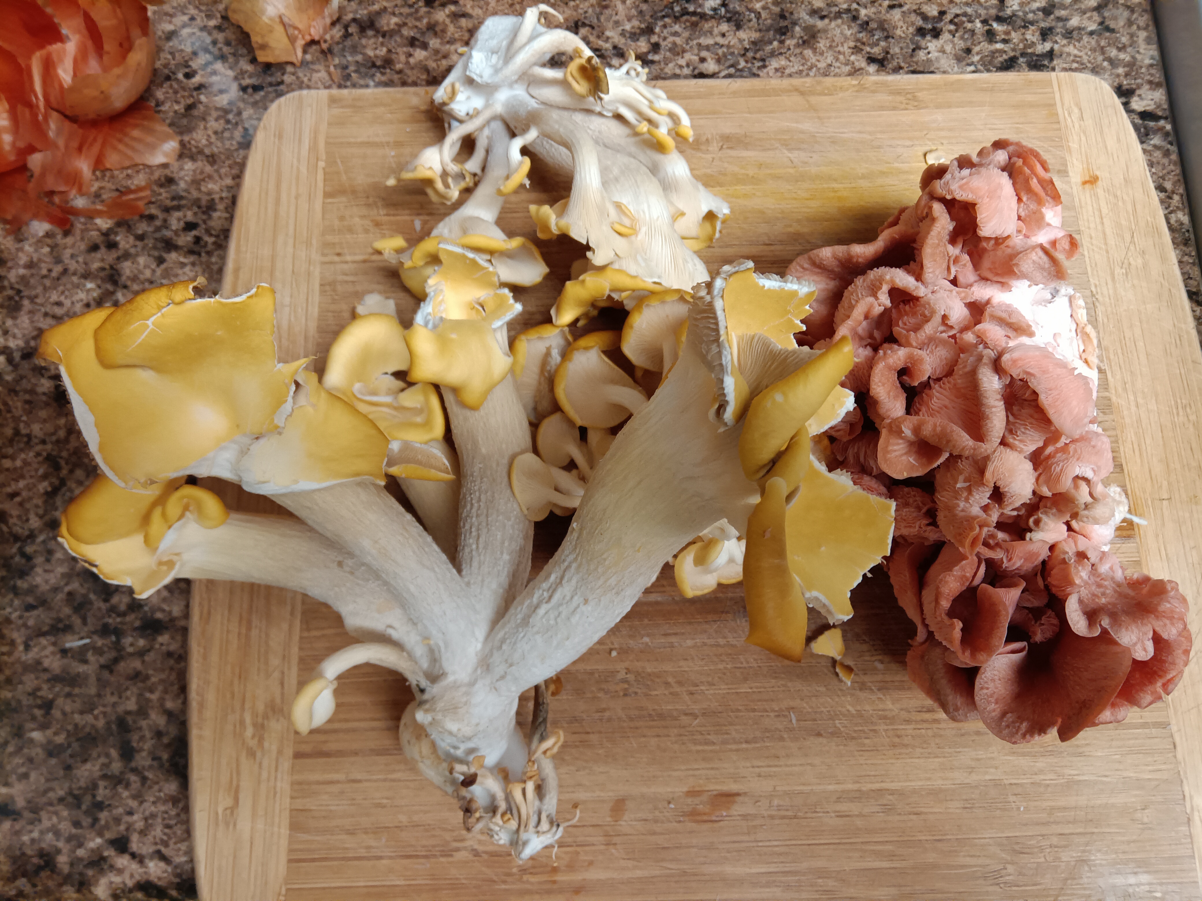 (1) Fun with fungi #2: golden and pink oyster mushrooms, sauteed with onion and garlic in olive oil and butter. These varieties took longer to cook, so since I set some aside for a quiche, I'm debating how to handle 'em when I put it together.
